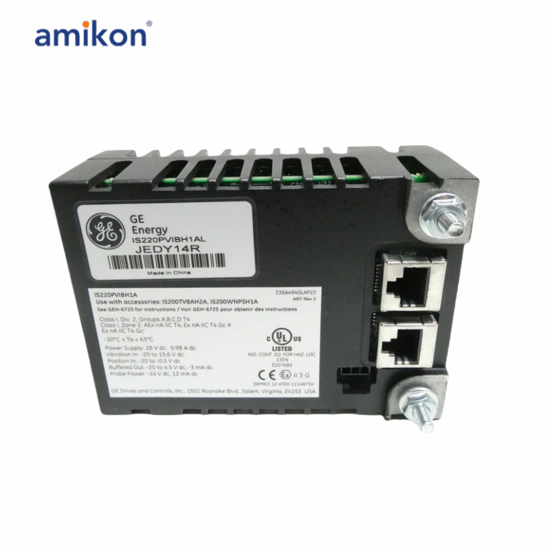 IS220PVIBH1AL is manufactured by GE, it is belong to Mark Vie series Vibration I/O Pack. The IS220PVIBH1AL (PVIB for short) vibration monitoring module contains a local processor and data acquisition board, which are housed in an I/O pack. Either one or three I/O packs can be mounted on the TVBA terminal board, to provide either Simplex or TMR module redundancy. The TVBA provides two 24-point, barrier-type terminal blocks that accept two 3.0 mm2 (#12AWG) wires with 300 V insulation and spade or ring type lugs.